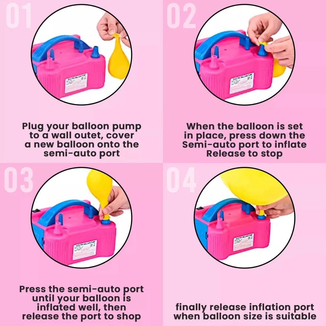 • Use with foil balloons carefully to avoid over‑inflation.